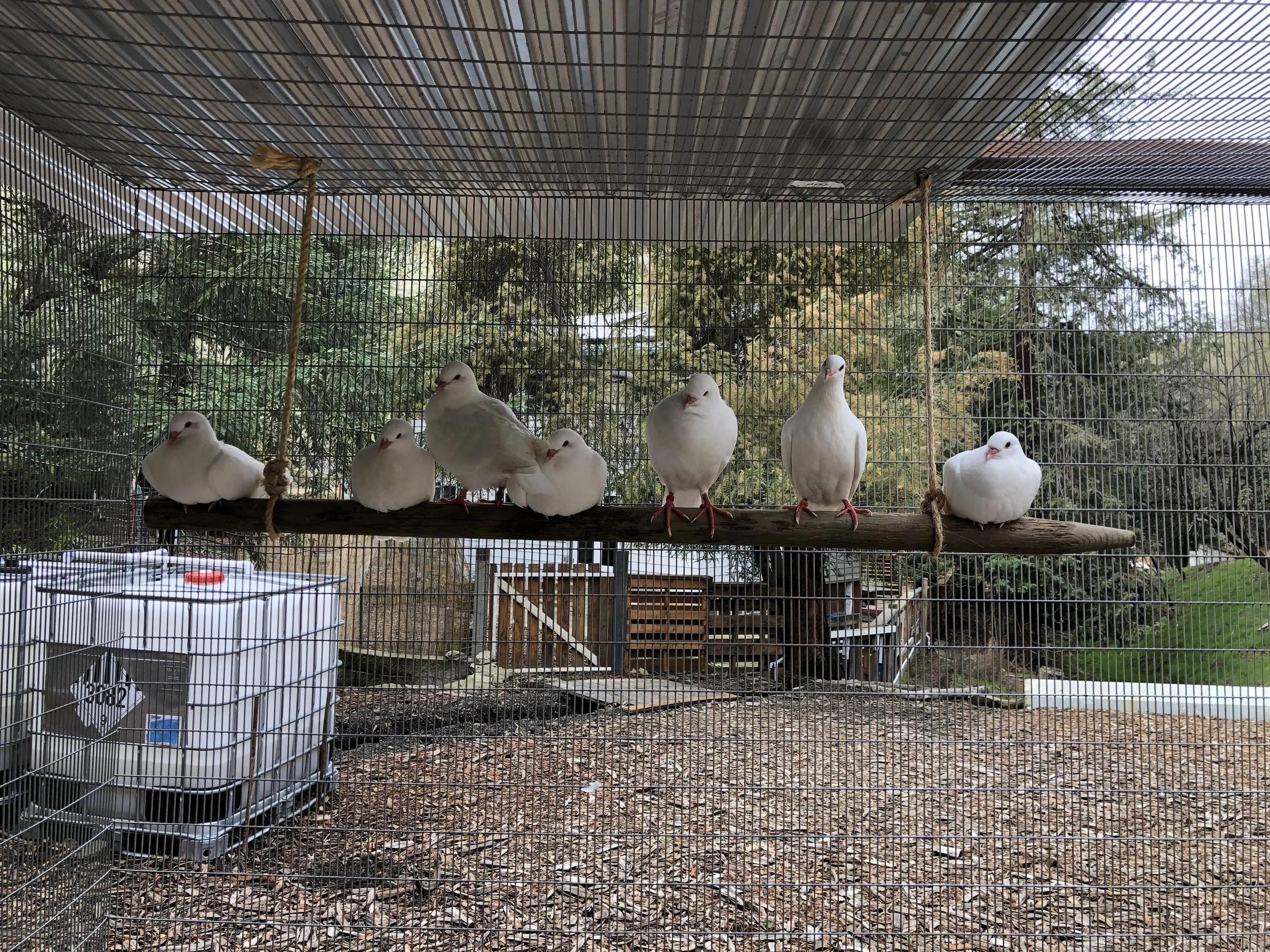 We have a nice pigeon aviary that houses 20-25 King Pigeons and Roller Pigeons at a time. They enjoy their swings, perches, cubbies, bathing tubs and greens. Many of them form a permanent bond with another pigeon and will share a cubby with them and bring food to each other.